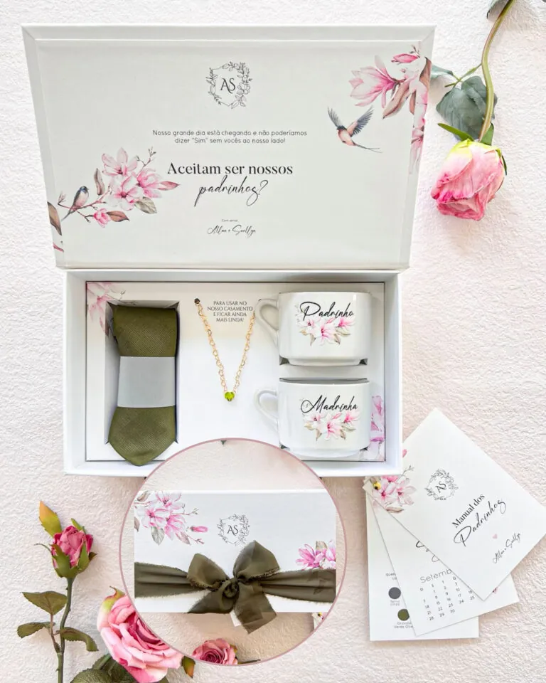 Apenas MADRINHA/MÃE: caixa com todos os itens, exceto a gravata que não acompanha essa versão.